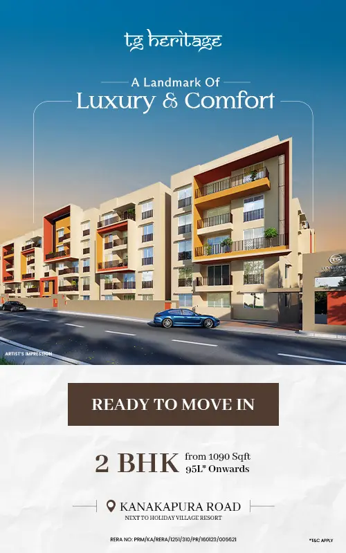 A unique project by TG Developers focusing on bringing tradition and modernity together. This thoughtfully planned architectural marvel is poised to become one of the city's most desirable landmarks. Located in the heart of Bangalore, TG Heritage is a convenient residence where you can build friendships that last a lifetime.